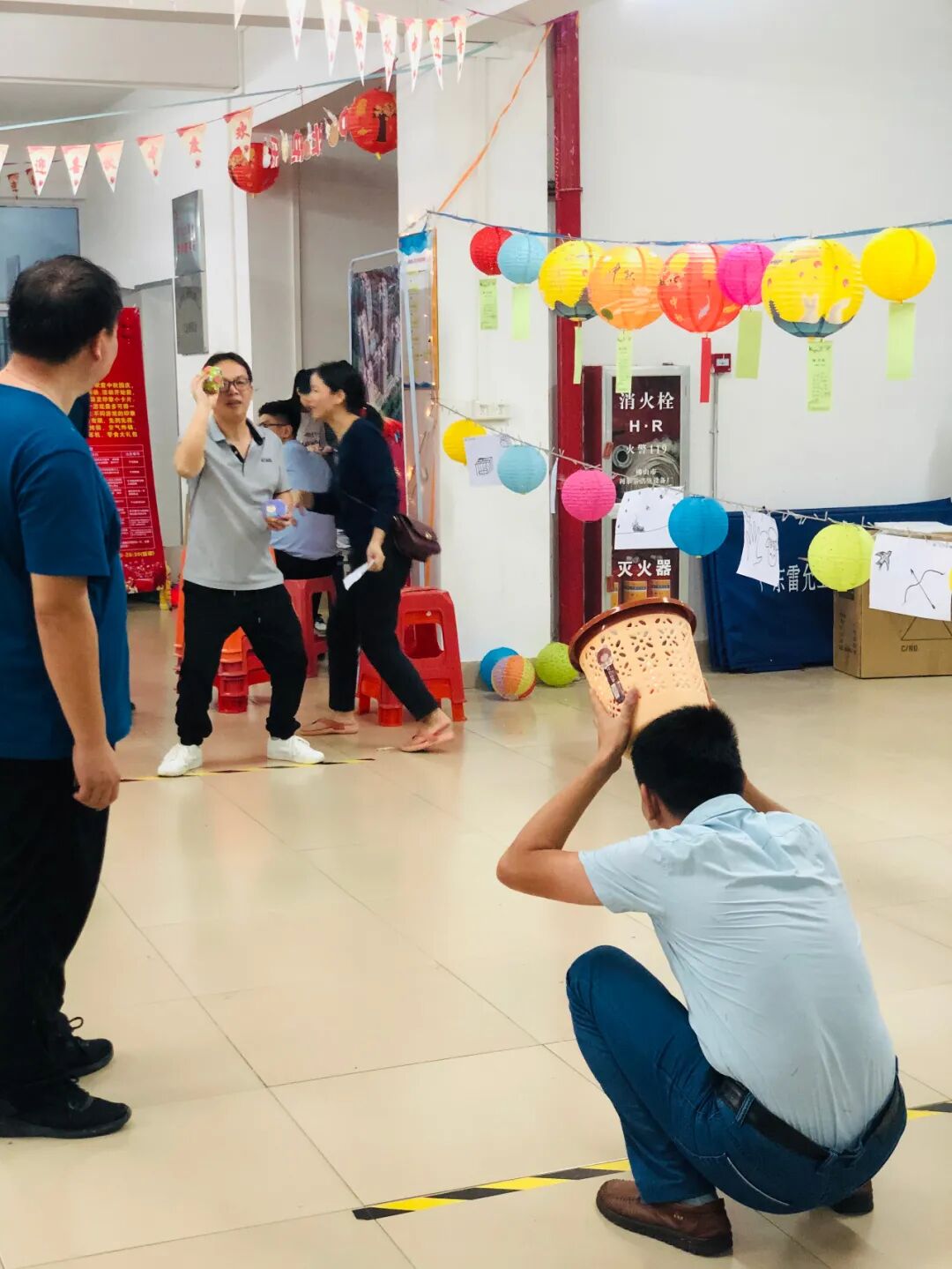 【你抛我接】游戏项目,同样是今年中秋游园会上“最具人气”游戏项目之一,考验参赛者与队友之间的配合,投球太高或者接球太低都难以完成进球数。